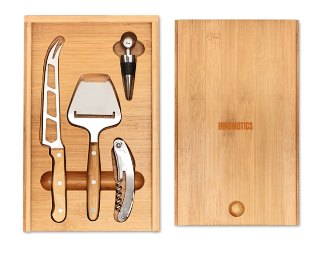 Bambusová sada na sýry a víno. Obsahuje ocelový nůž, škrabky na sýr, otvírák z nerezu a zátku na víno. Baleno v bambusové krabičce. Bambus je přírodní materiál, může dojít k mírným změnám barvy, dekorace a velikosti.